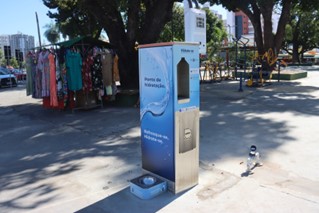 Um detalhe que chama atenção é o cuidado com os animais de estimação: cada estrutura conta com um dispositivo exclusivo para pets. Ao pressionar o botão, a água desce até um pequeno reservatório na base do equipamento, feito sob medida para que os bichinhos também possam sanar a sede com segurança durante os passeios.